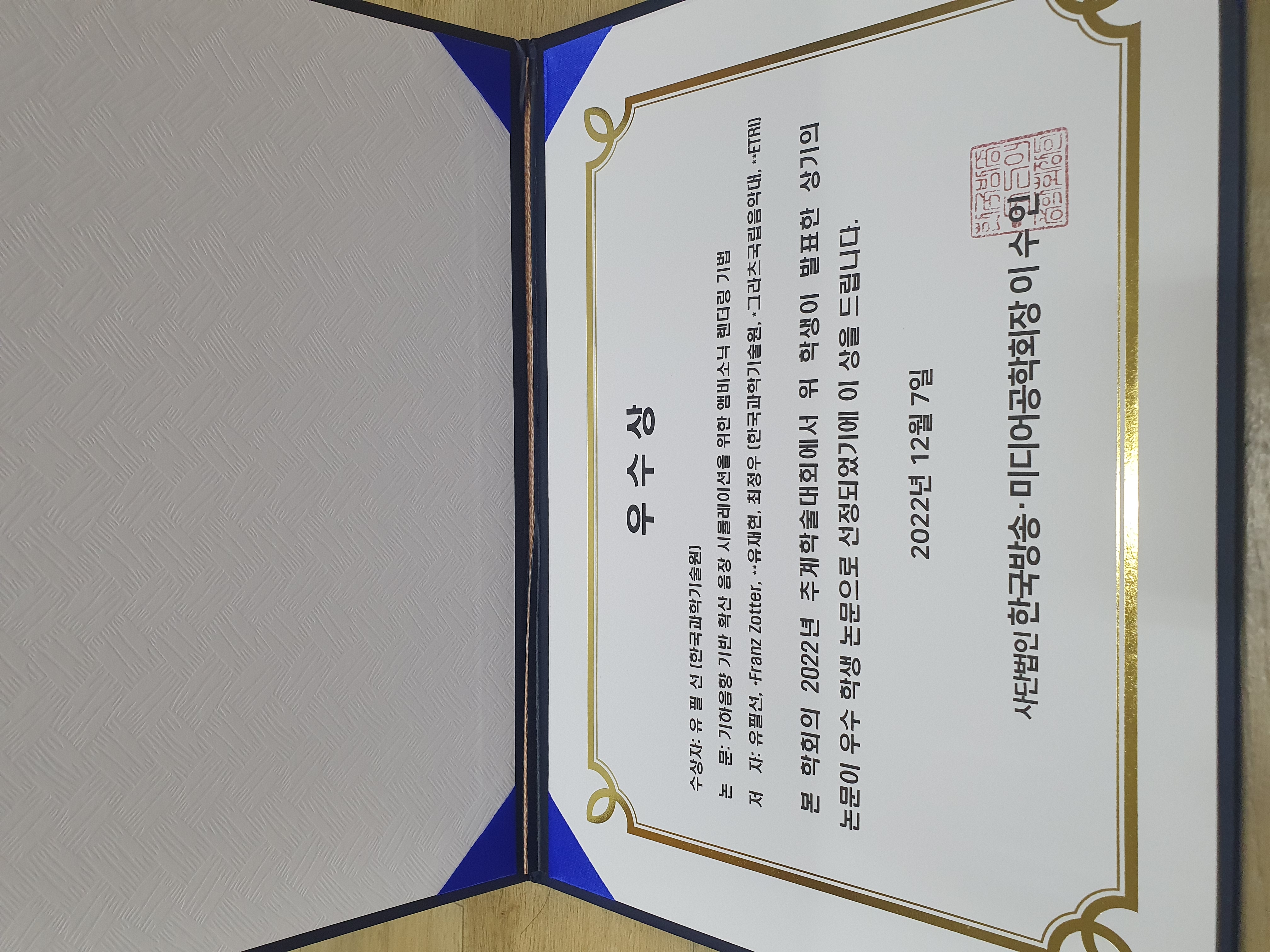 news유필선 석사과정이 2022년 한국 방송 미디어 공학회 추계학술대회에서 우수 학생 논문상을 수상하였습니다. 우수학생논문상4: 유필선 (KAIST) 기하음향 기반 확산 음장 시뮬레이션을 위한 앰비소닉 렌더링 기법 유필선, *Franz Zotter, **유재현, 최정우 / 한국과학기술원, *그라츠국립음악대, **ETRI