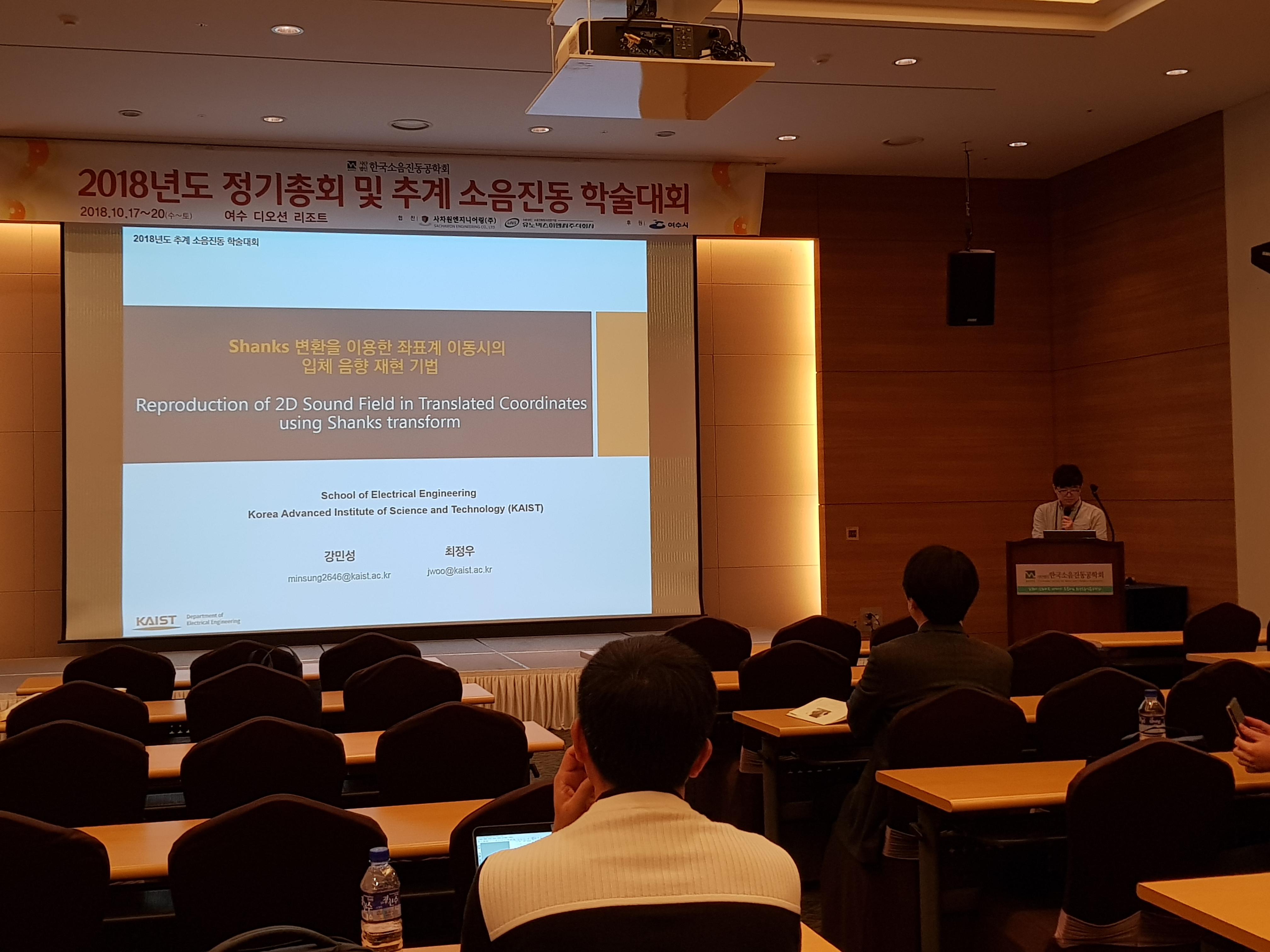 news2018년도 추계 소음진동학술대회 The KSNVE Annual Atumn Conference 2018 강민성, 최정우, " Shanks 변환을 이용한 좌표계 이동시의 입체 음향 재현 기법 ", 2018년도 추계 소음진동학술대회, 여수, 대한민국, p.76, 2018년 10월 17~20일. Minsung Kang and Jung-Woo Choi, "Reproduction of 2D Sound Field in Translated Coordinates using Shanks transform", the KSNVE Annual Autumn Conference 2018, Yeosu, Korea, p.76, 17~20 October, 2018 소형준, 정경석, 최정우, " 차량용 독립음장시스템의 저주파수 성능 향상을 위한 워핑 필터 설계 ", 2018년도 추계 소음진동학술대회, 여수, 대한민국, p.77, 2018년 10월 17~20일. Hyungjun So, Kyeongseok Jeong and Jung-Woo Choi, "Design of Frequency Warped Filter to Improve Low Frequency Performance of Personal Sound System in Car Cabin", the KSNVE Annual Autumn Conference 2018, Yeosu, Korea, p.77, 17~20 October, 2018 강민성(Minsung Kang) 발표 사진